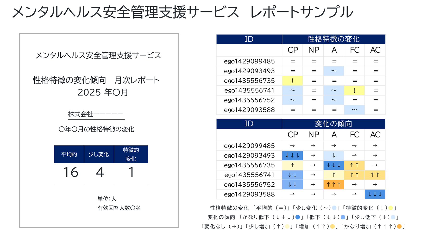 - 翌月10日までに前月分の月次レポートを管理者さまにご報告いたします。匿名化した状態での報告となりますので、従業員さまとの照会は管理者さまにてご対応ください。
